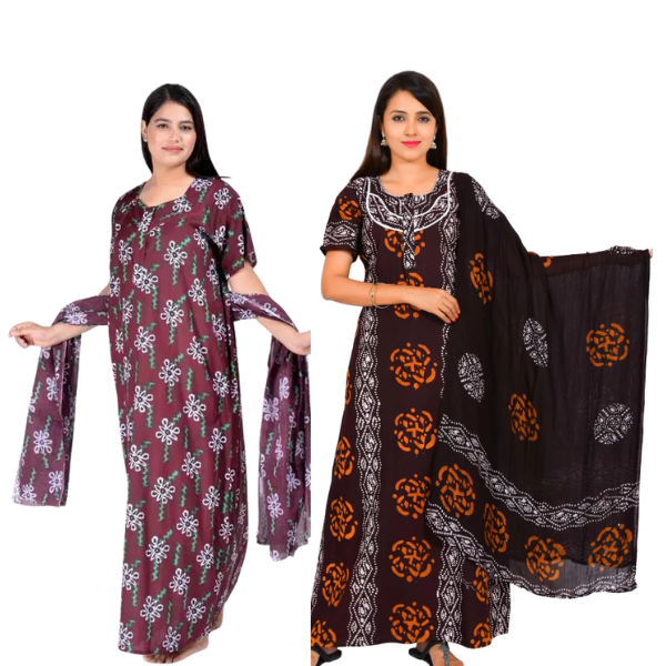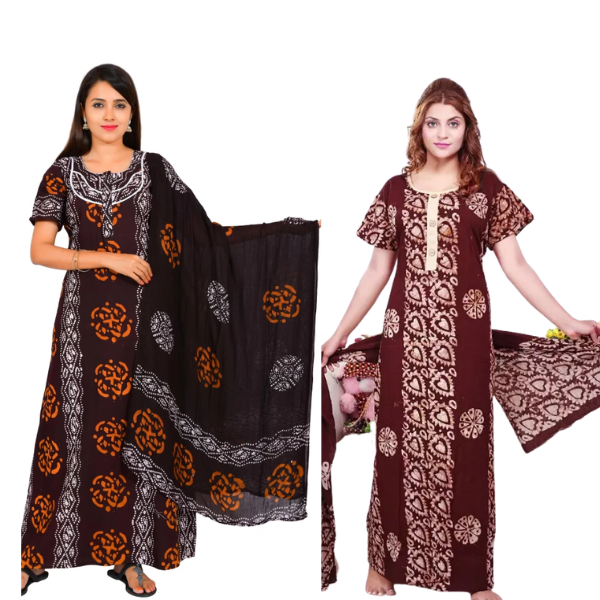 Women's Cotton Printed Regular Nighty With Dupatta/Maxi /Night Dress Pack Of 2 (Free Size) Black & Brown