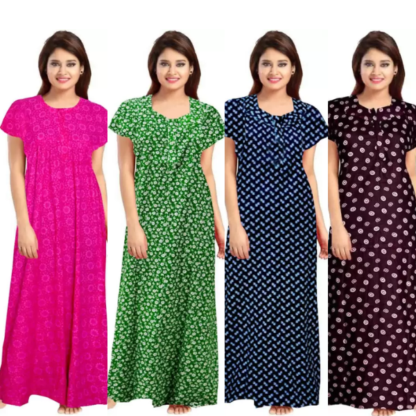 Women's Cotton Printed Regular Nighty/Maxi /Night Dress Pack Of 4 (Free Size) Black, Green, Pink, Blue