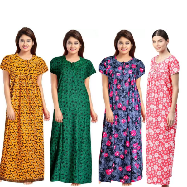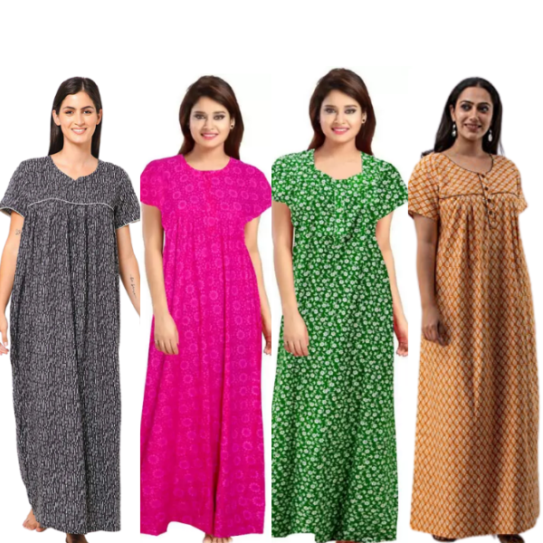 Women's Cotton Printed Regular Nighty/Maxi /Night Dress Pack Of 4 (Free Size) Grey, Yellow, pink ,green