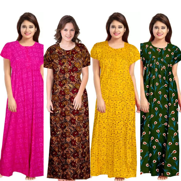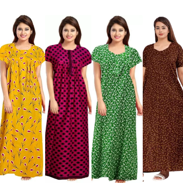 Women's Cotton Printed Regular Nighty/Maxi /Night Dress Pack Of 4 (Free Size) Pink, yellow, Grey, Brown