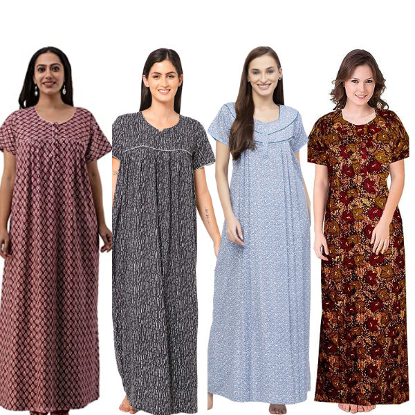 Women's Cotton Printed Regular Nighty/Maxi /Night Dress Pack Of 4 (Free Size) Red , Grey ,Blue , Brown